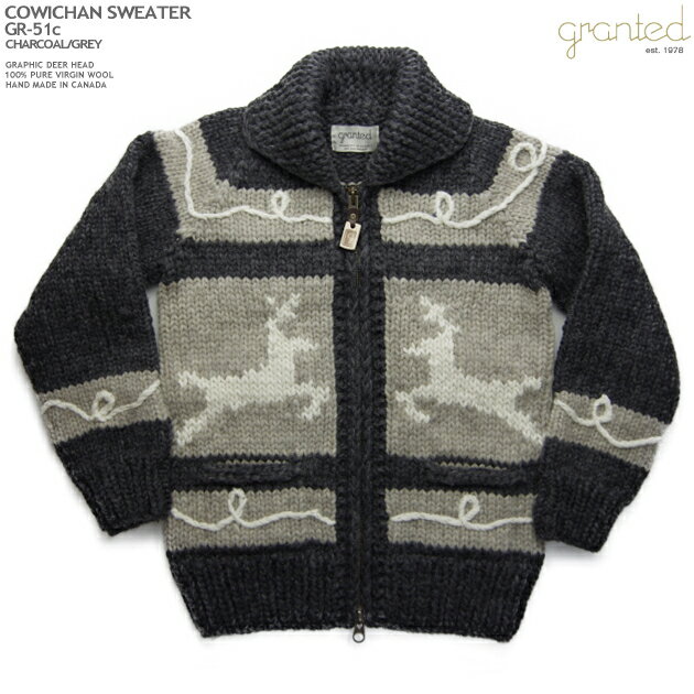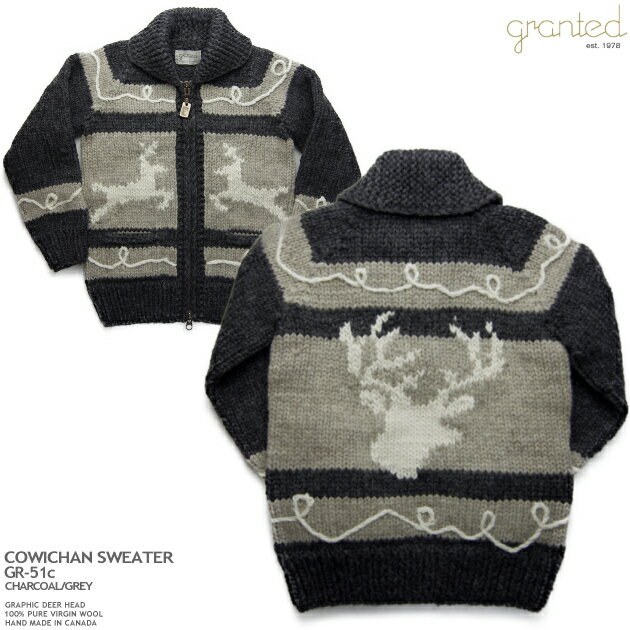 カウチンセーター|granted(グランテッド)|カナダ製|GR-51c GRAPHIC DEER HEAD(グラフィック・ディア・ヘッド)|チャコール/グレイ|メンズ|ウール100%|フルオープン|YKK製ジップアップ(two-way YKK Zipper)|木製ラベルの引き手|カウチンニット|長袖